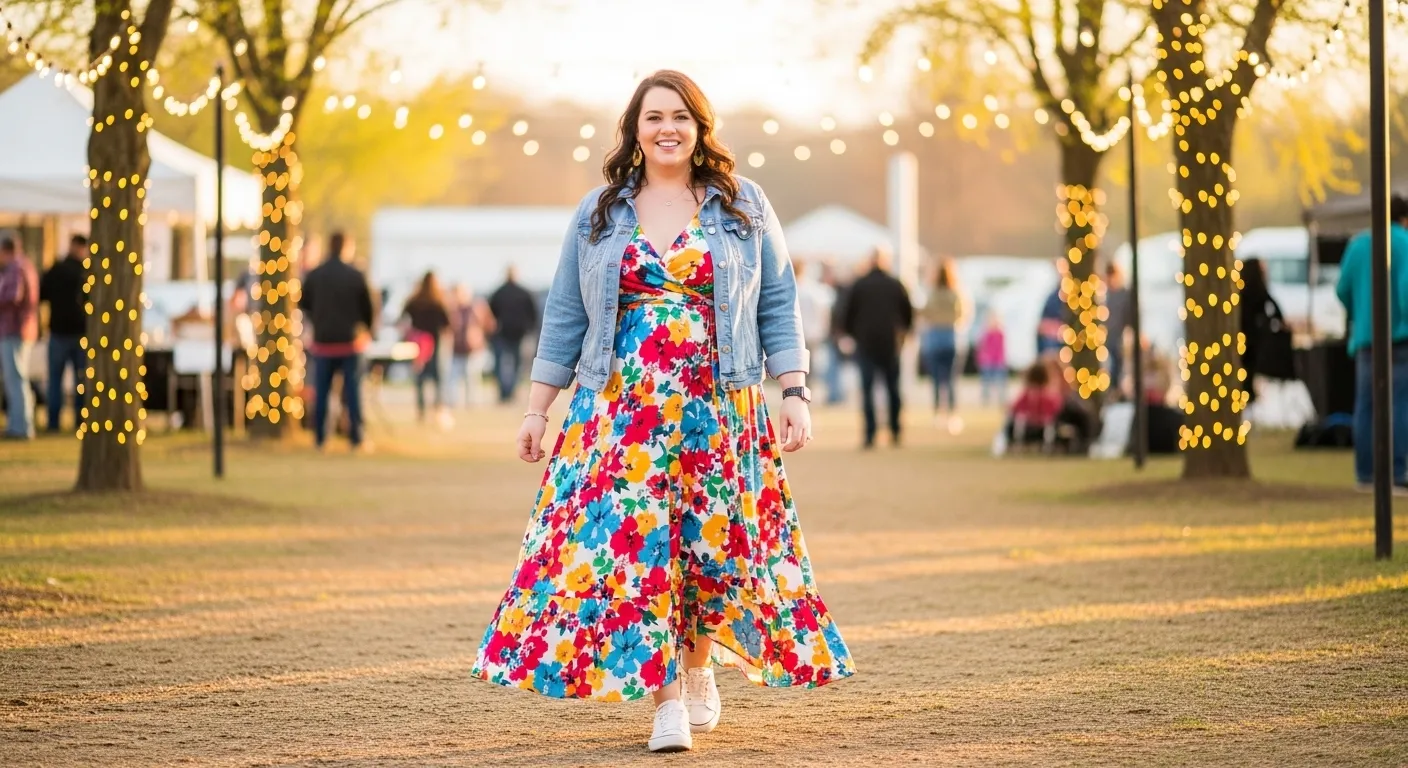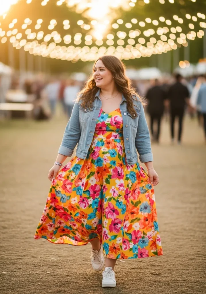 A bright floral midi dress instantly sets the tone for a cheerful spring festival day. The dress features bold multicolor blooms on a flowing fabric that moves beautifully while walking through the festival grounds. A light blue denim jacket adds a relaxed layer that balances the vibrant print. White sneakers keep the look comfortable and practical for wandering between food stalls and music stages while warm string lights glow softly in the background.