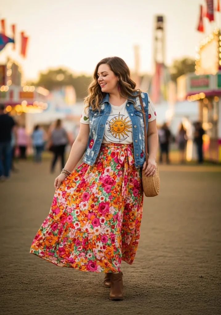 A vibrant floral maxi dress brings bold color and movement to this festival look. The long skirt sways beautifully while the bright flower pattern adds playful charm. A cropped denim vest gives the outfit a relaxed layered feel and ankle boots add a little bit of festival edge.