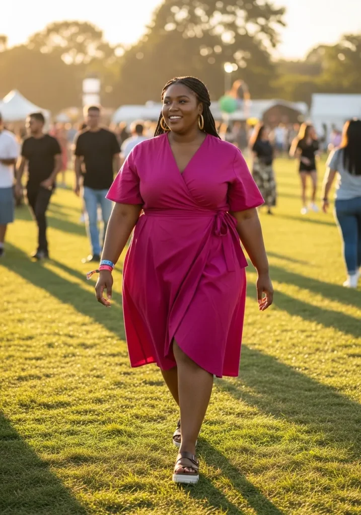 A bold pink wrap dress creates a vibrant and confident festival outfit. The wrap shape flatters the waist while the flowing skirt moves beautifully in the warm outdoor light. Simple sandals keep the look relaxed and perfect for walking across grassy festival grounds.