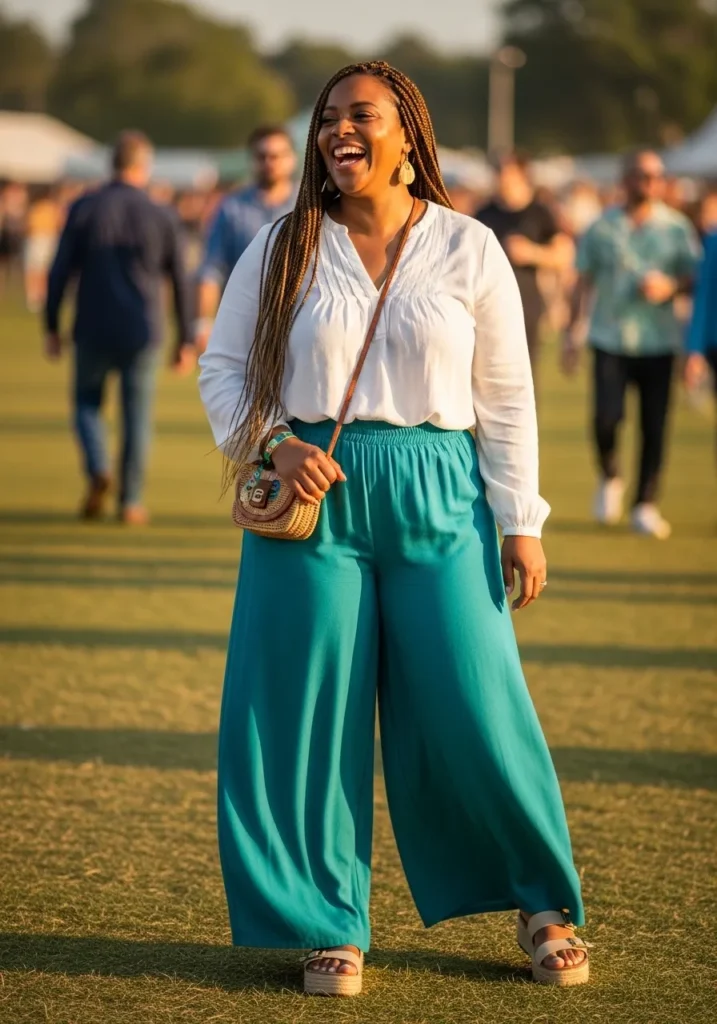This outfit pairs wide leg teal trousers with a lightweight white blouse for a look that feels fresh and breezy. The soft drape of the pants creates beautiful movement while the tucked blouse adds a clean and polished touch. A small crossbody bag and simple sandals complete the outfit in a relaxed and practical way.