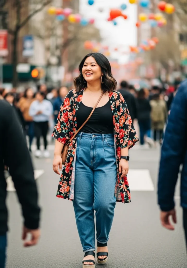 Floral Kimono With Classic Denim And Black Top