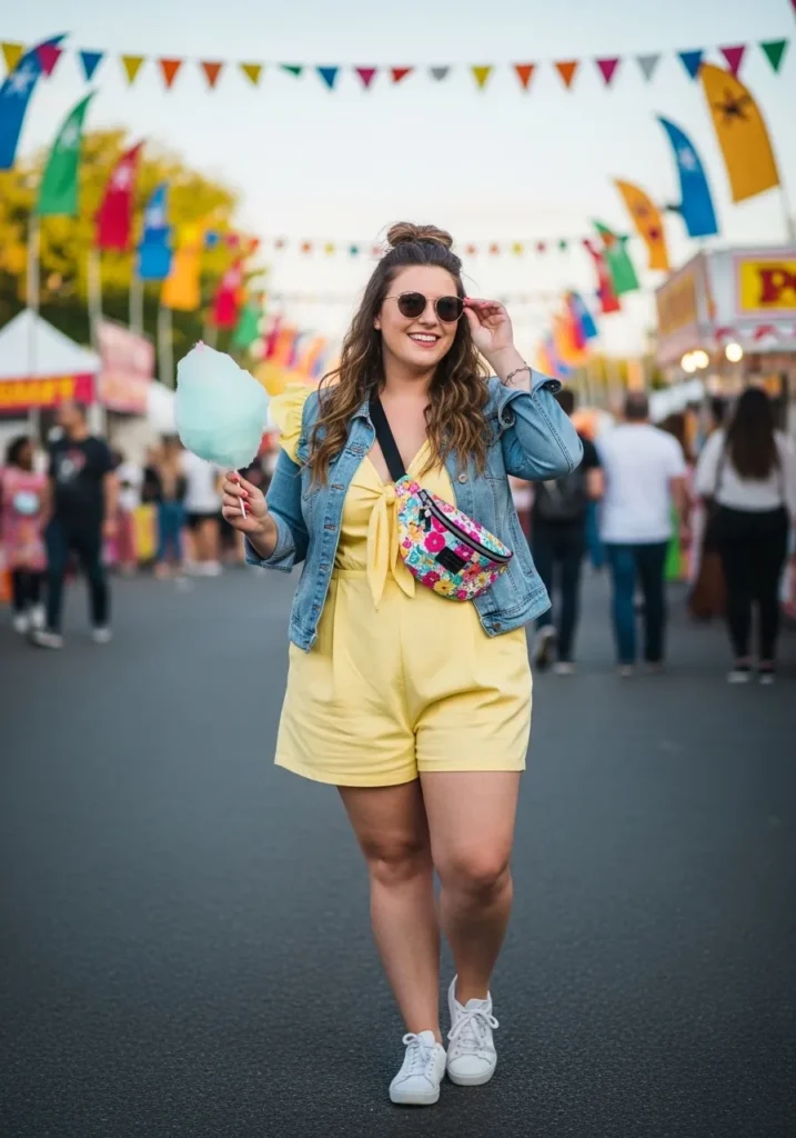 A soft yellow romper creates a bright and cheerful festival outfit that feels perfect for warm spring afternoons. The relaxed shape keeps the look easy and comfortable while a cropped denim jacket adds a casual layer. White sneakers finish the outfit and keep everything ready for walking through busy festival streets.