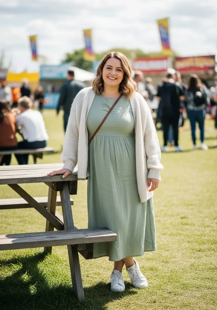 A flowing sage green midi dress paired with a lightweight cream cardigan creates a calm and elegant festival look. The soft fabric of the dress moves gently while the cardigan adds a cozy layer for cooler moments. White sneakers keep the outfit casual and practical for outdoor events.