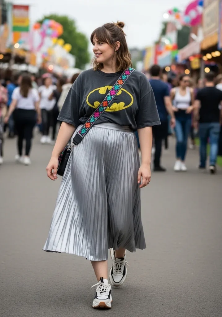 A relaxed graphic tee tucked into a silver pleated midi skirt creates a fun mix of casual and statement style. The metallic fabric catches the light beautifully while the loose tee keeps the outfit grounded and easy. Chunky sneakers add comfort and give the look a modern street style feel.