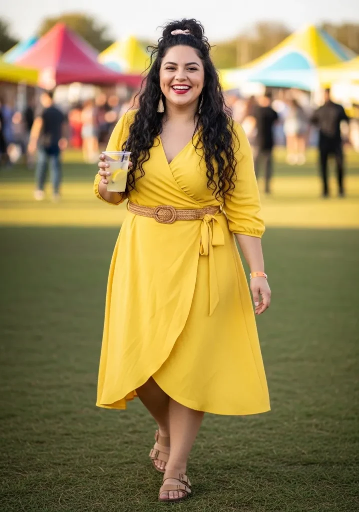 This cheerful yellow wrap dress is pure sunshine in outfit form. The soft fabric drapes beautifully across the body and the wrap waist creates a flattering shape that feels light and effortless. The bright color pops against the grassy festival setting while neutral sandals keep the look relaxed and easy to walk in.