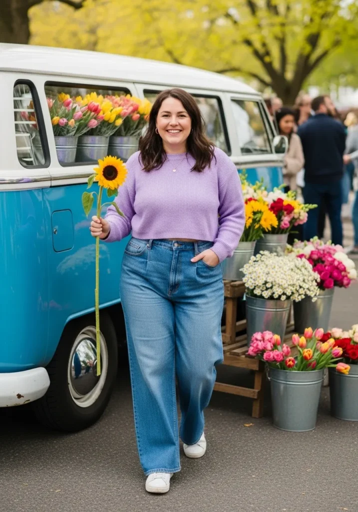 A soft lavender sweater paired with relaxed fit blue jeans creates a cozy and cheerful festival outfit. The pastel shade feels perfect for spring while the classic denim keeps the look casual. White sneakers complete the outfit and keep everything comfortable for a day spent walking between flower stands and food trucks.