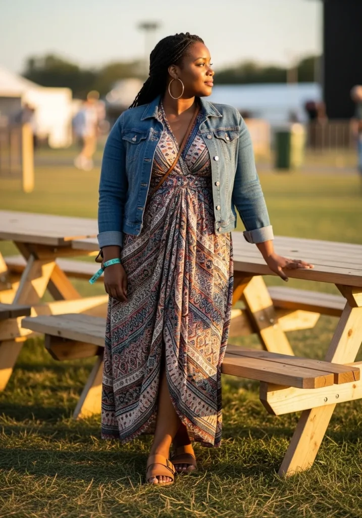 I always think maxi dresses are perfect for festivals because they move so beautifully when you walk. Adding a denim jacket keeps the outfit from feeling too dressy. For me this combination always feels comfortable and stylish.