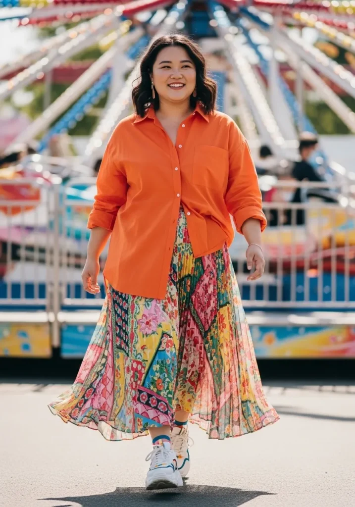 A bold orange button up shirt layered over a colorful patterned skirt creates a vibrant festival look full of personality. The bright top brings a burst of color while the skirt adds playful movement and pattern. White sneakers keep the outfit grounded and comfortable for busy festival paths.