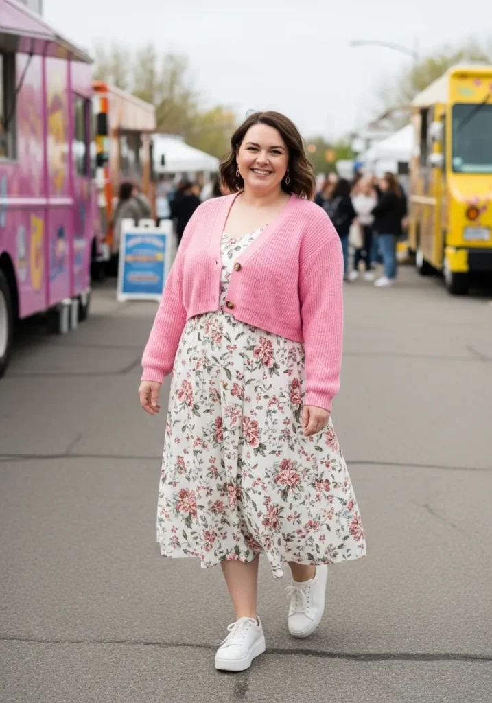 A delicate floral midi dress paired with a soft pink cardigan creates a sweet and comfortable festival look. The light print feels fresh for spring while the cardigan adds a cozy touch for cooler moments during the day. White sneakers keep the outfit practical and give it a casual everyday feel that works perfectly for strolling between food trucks and vendor booths.