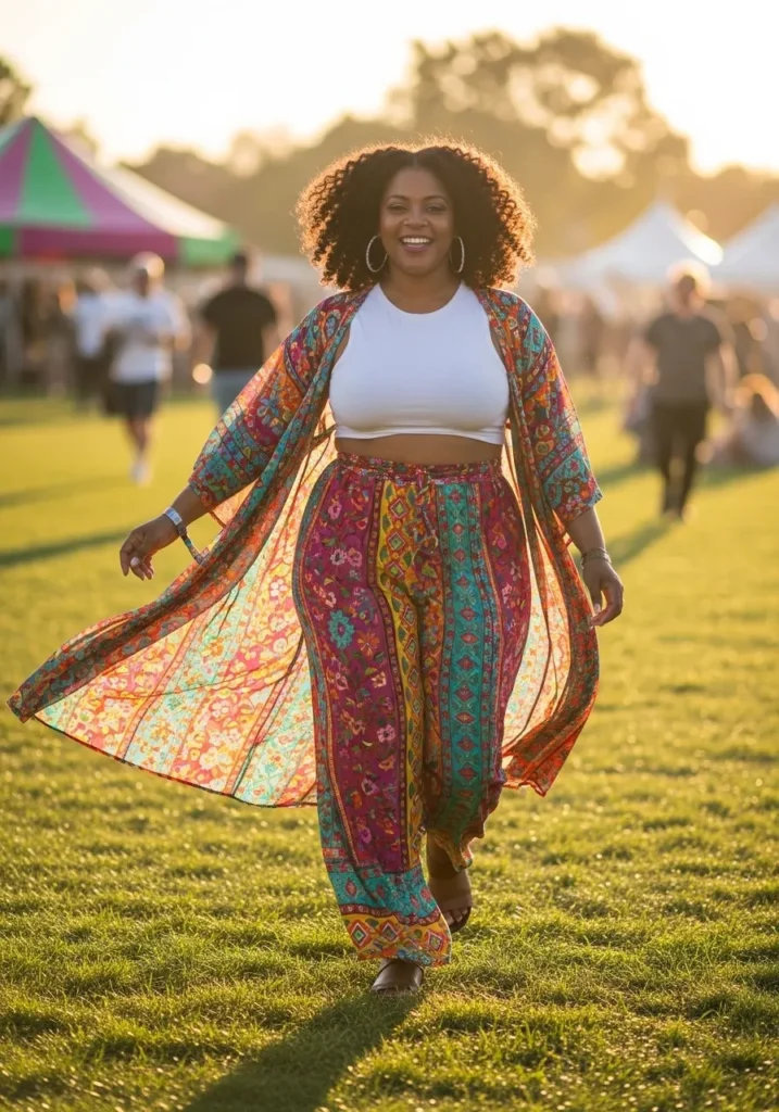 This lively festival outfit pairs a simple white crop top with vibrant patterned wide leg pants that immediately catch the eye. A sheer colorful kimono flows beautifully over the look and adds extra movement while walking across the grassy festival grounds. The relaxed silhouette keeps everything breezy and comfortable in warm spring weather.