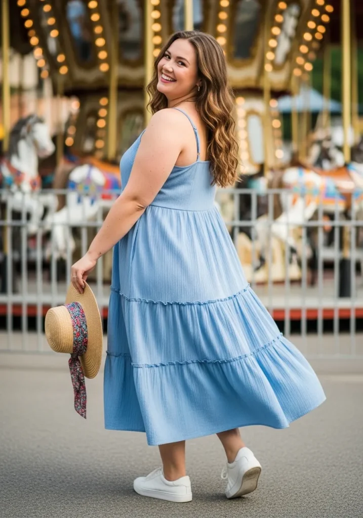 A soft blue tiered midi dress creates a light and airy festival outfit that looks lovely in motion. The tiered skirt adds gentle volume while the sleeveless cut keeps the outfit cool for a sunny afternoon. White sneakers keep things comfortable and a straw hat adds a charming detail that fits perfectly with the carousel backdrop.