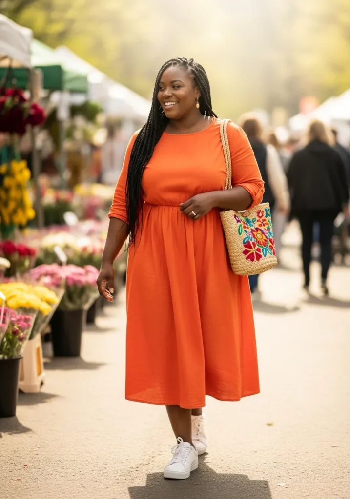 A bold orange midi dress brings vibrant color to the festival walkway. The relaxed fit allows the fabric to move freely while walking and the simple silhouette keeps the look modern and easy. White sneakers add comfort for long festival days while a colorful tote bag adds an extra pop of personality.