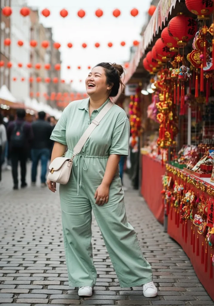 A relaxed mint green jumpsuit creates a stylish one piece outfit that feels both modern and comfortable. The loose fit and soft fabric make it perfect for wandering through colorful festival markets. White sneakers add a sporty touch while a small crossbody bag keeps essentials close.