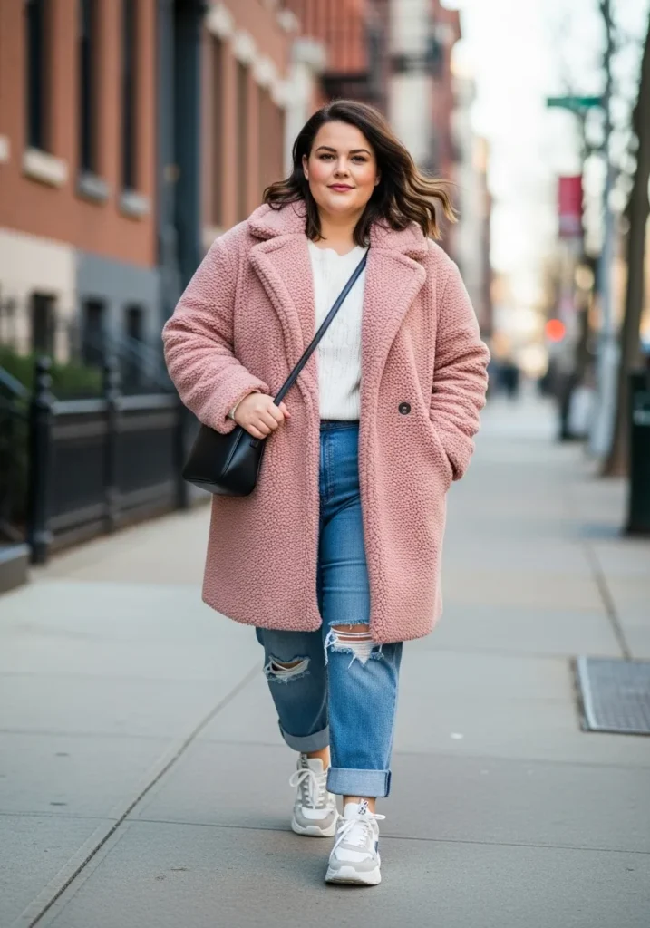 This look is all about cozy texture and soft winter charm. The outfit features a plush pink teddy coat that instantly adds warmth and personality, layered over a simple white knit sweater for that clean and classic base. The relaxed fit jeans with light distressing give the whole look a casual street style vibe, while the folded cuffs and chunky white sneakers keep everything feeling fresh and effortless. A small black crossbody bag finishes the outfit with a touch of practicality and contrast that ties everything together.
