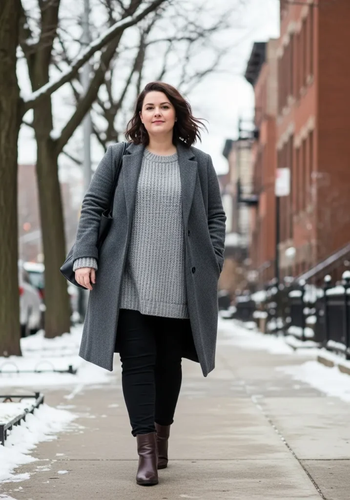This look blends the coziest winter textures with a polished city vibe. The outfit features a long charcoal coat with clean lines that gives everything a sleek frame. Underneath she wears a chunky knit sweater in a soft heather grey that looks warm without feeling bulky. Black skinny jeans keep the silhouette streamlined while dark brown ankle boots add a touch of contrast. The whole look feels effortless and pulled together with a simple black shoulder bag completing the outfit.