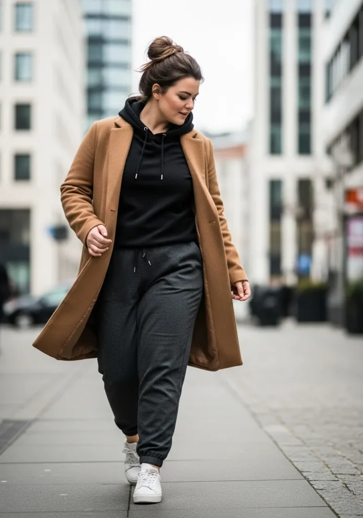 This outfit mixes comfort with that effortless city girl confidence. A long camel coat brings warmth and polish while the black hoodie underneath keeps everything relaxed and comfy. The charcoal joggers add a soft, cozy feel that still looks put together and the white sneakers give the whole look a clean and balanced finish. The vibe is very modern and minimal with just the right mix of sporty and chic.