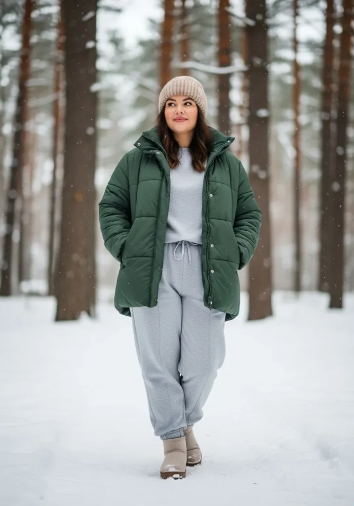 This outfit is all about soft comfort wrapped in clean, modern colors. The look pairs a deep forest green puffer jacket with a light grey matching sweat set that feels plush and laid back. The joggers have a relaxed fit with a drawstring waist and gathered cuffs that sit perfectly over warm beige winter boots. A chunky knitted beanie in a neutral tone finishes the look with that classic winter charm. Everything about this combo feels effortless, warm, and totally practical for snowy days.