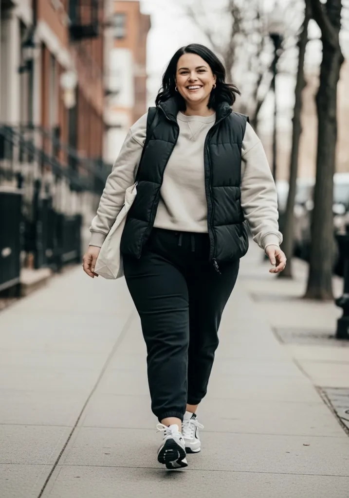 This look is all about easy comfort with a cute city girl twist. The black puffer vest adds that warm cozy layer we all reach for once the air gets chilly and it pairs so well with the soft beige sweatshirt underneath. The joggers match the relaxed vibe with their simple black color and comfy fit. White sneakers keep everything fresh and practical for errands or a long walk and the casual canvas tote ties the whole outfit together with an effortless feel. The overall vibe is cozy sporty and totally everyday friendly.
