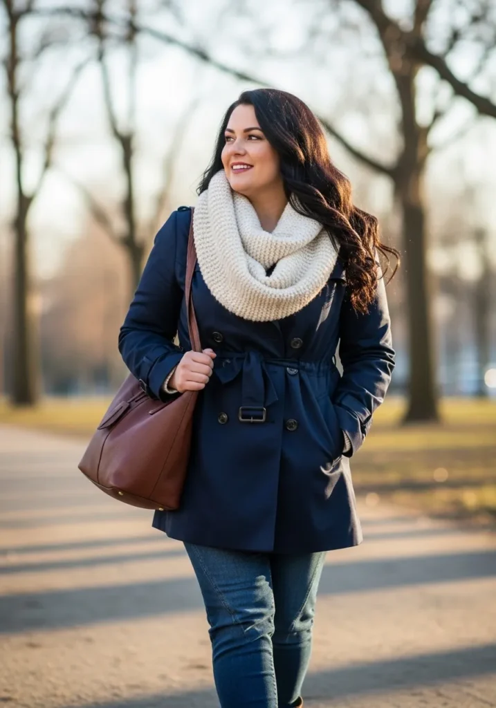This outfit pairs a sleek navy trench coat with a soft cream knit infinity scarf that looks wonderfully warm and cozy. The coat has a classic double breasted cut with a tie waist that pulls the whole look together in such an effortless way. She carries a roomy brown leather bag that adds a polished touch and the blue denim keeps everything relaxed and easy for everyday winter errands. The whole vibe feels clean and put together but still super comfortable for chilly days outside.