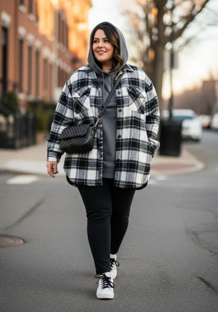 This outfit is all about laid back winter comfort with a cute street style twist. The look mixes a soft charcoal hoodie with an oversized black and white plaid shacket that gives the whole outfit that cozy layered feel we all love when the air gets chilly. Paired with fitted black leggings and crisp white sneakers, it feels casual and pulled together at the same time. The black crossbody bag adds a little edge and keeps everything practical for a day of walking around the city.
