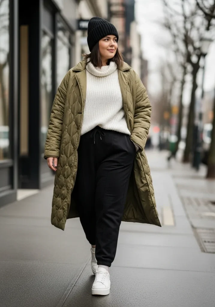 I love how this outfit hits that sweet spot between comfort and style. The long quilted coat adds shape without swallowing the figure and the cozy sweater gives the outfit that soft winter charm I always want when it gets chilly. The joggers balance the bulk of the top layers and the sneakers make the whole look feel modern and fresh. It is the kind of outfit I would wear on repeat because it feels flattering and practical while still giving me that casual chic confidence boost.