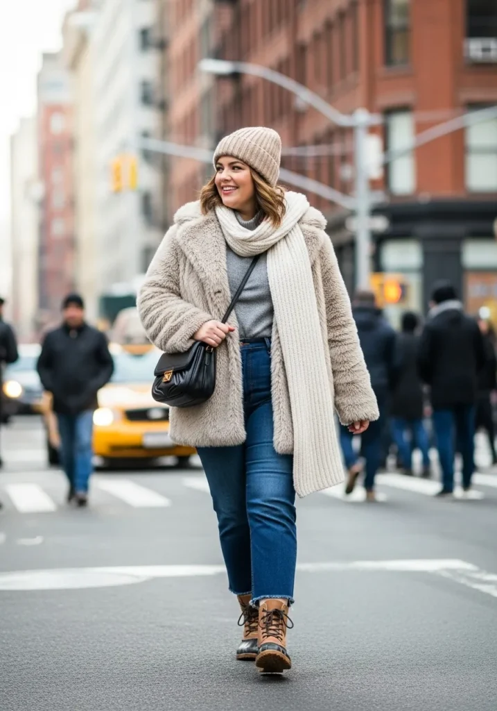 This outfit brings together all the soft neutrals that make winter dressing feel warm and effortless. The look starts with a plush beige faux fur coat that adds instant coziness, paired with a simple grey knit top for a clean base. She wears medium wash jeans with a slightly cropped hem that shows off a pair of sturdy tan winter boots built for city sidewalks. A ribbed cream scarf and matching beanie finish everything with that perfect bundled up vibe. The black crossbody bag adds a little contrast while keeping the outfit practical for busy days out.