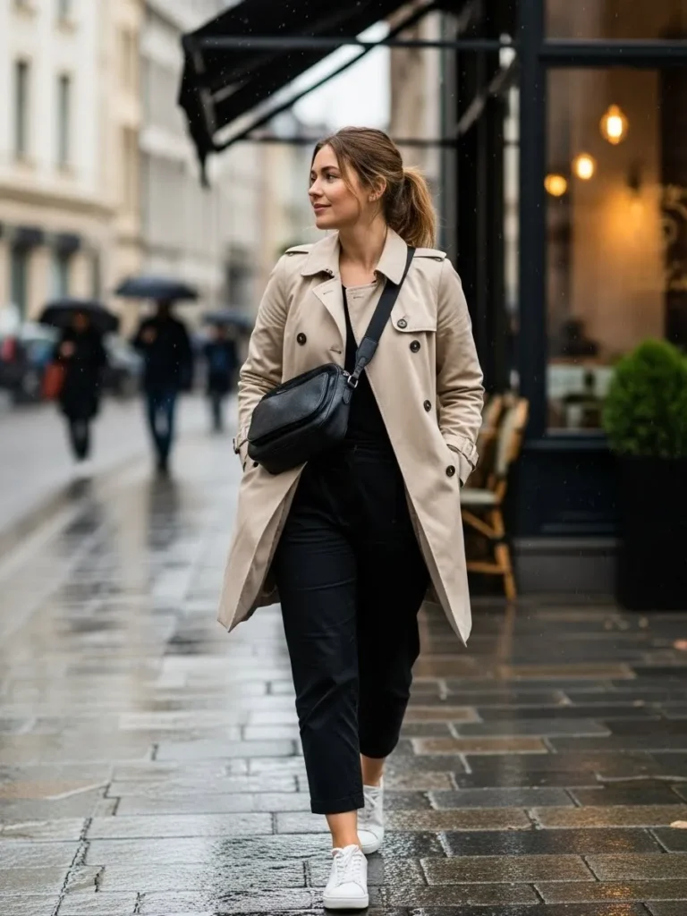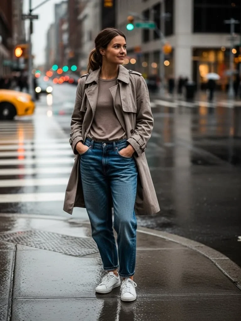 The trench instantly elevates the basics, and the sneakers keep it grounded and walkable, which feels perfect for a busy rainy day downtown.