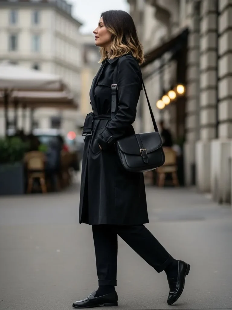 A black belted coat is paired with dark layers underneath and finished with a small shoulder bag and sleek shoes.