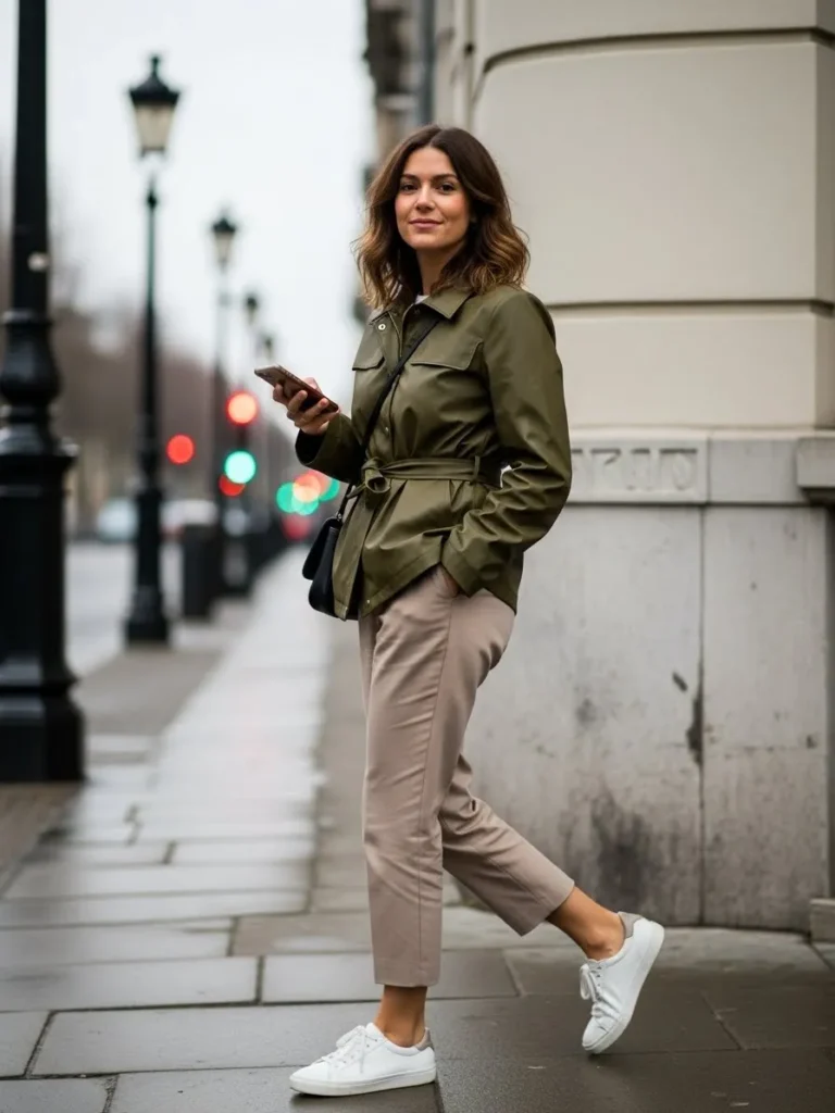 A cropped olive jacket is styled with a simple top, tailored beige pants, and clean white sneakers.