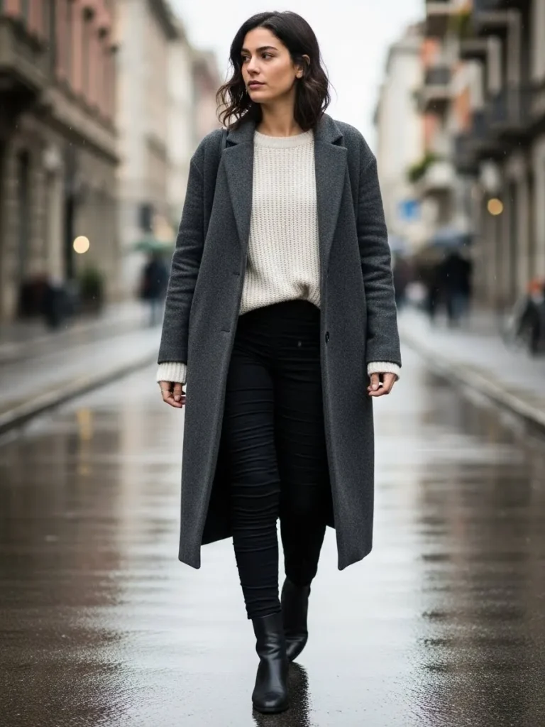 A long charcoal gray coat takes center stage here, worn over a light sweater and fitted black pants, paired with sleek ankle boots.