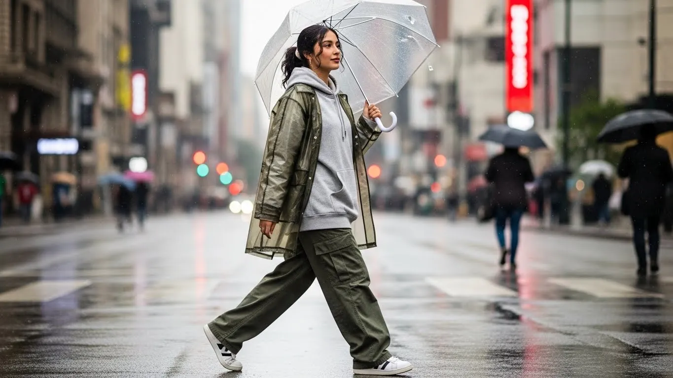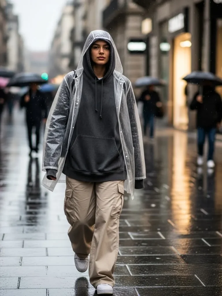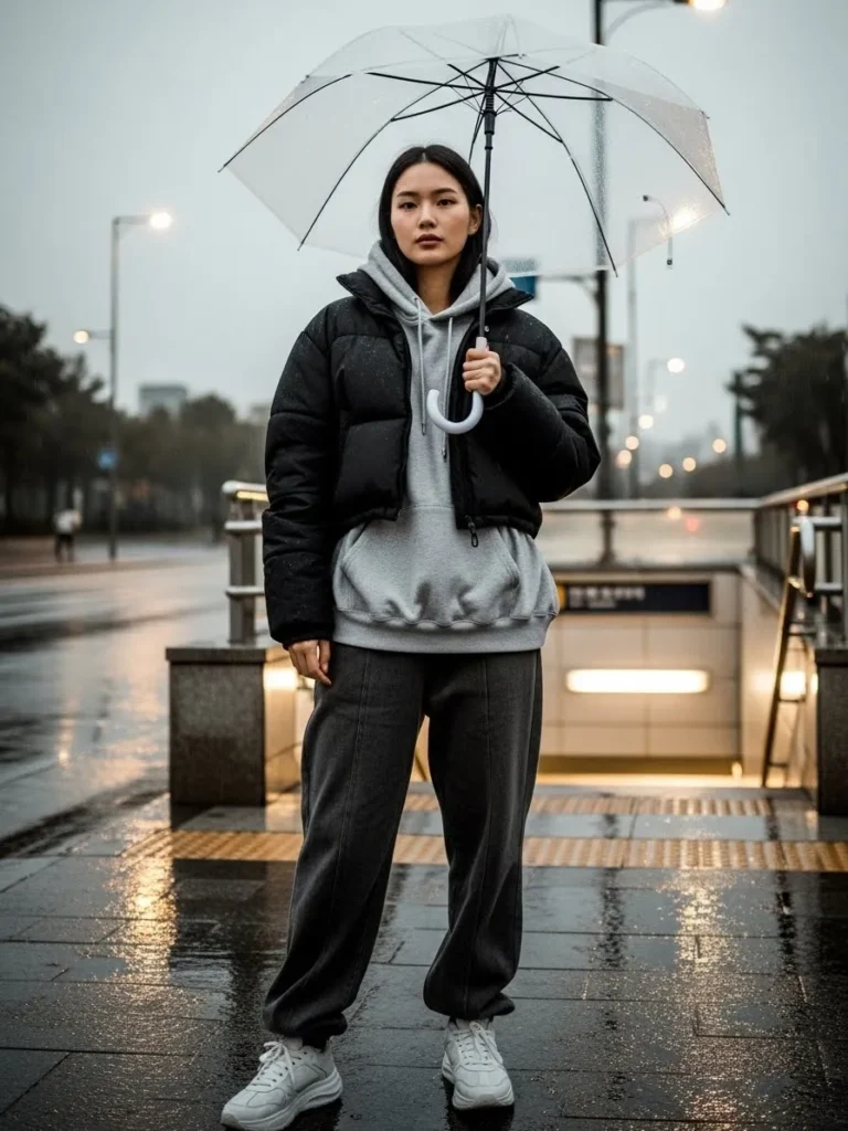 The relaxed shapes and soft fabrics give the outfit a casual street feel that fits right into a rainy city scene.