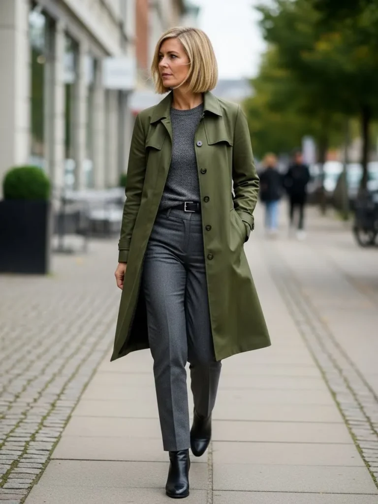 A long olive green coat is styled with a soft beige sweater, gray trousers, and casual sneakers.