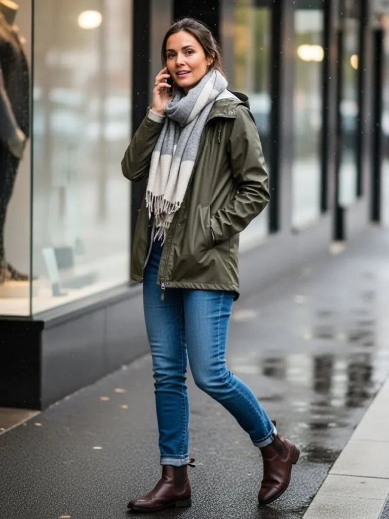 The mix of classic outerwear and casual denim gives this outfit an effortless rainy day balance.