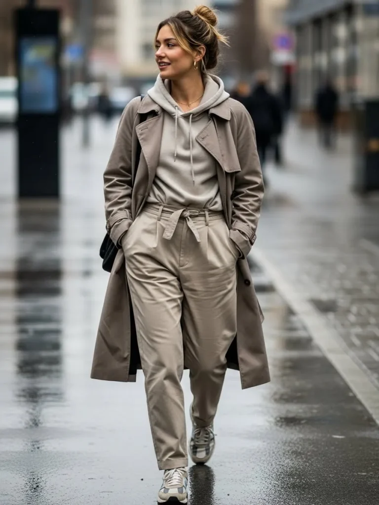 A beige trench coat is styled over a soft neutral outfit, paired with casual shoes for walking the city.