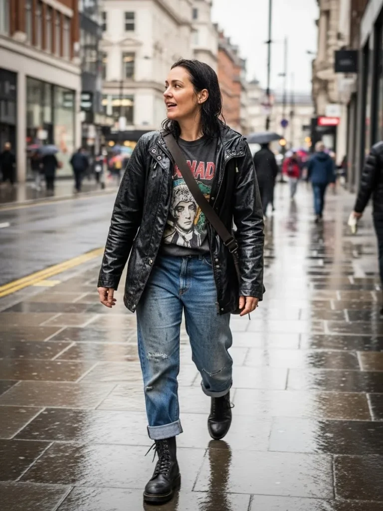 This outfit pairs a black leather jacket with a graphic tee, relaxed blue jeans, and sturdy boots that can handle wet pavement.