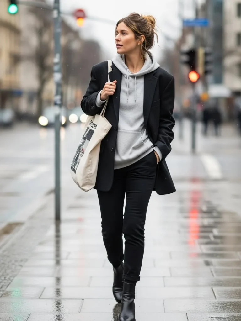 A black blazer layered over a gray hoodie creates a cool contrast, paired with slim black pants and ankle boots.