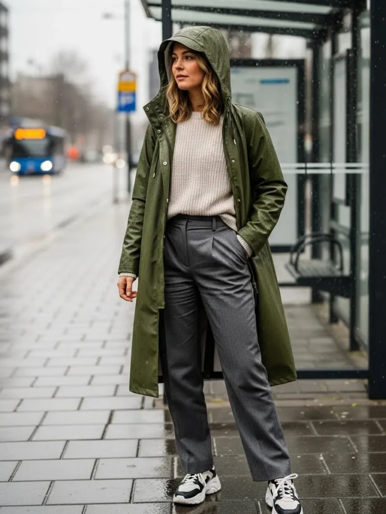 The outfit feels practical and cozy, perfect for colder rain, while still looking clean and intentional.