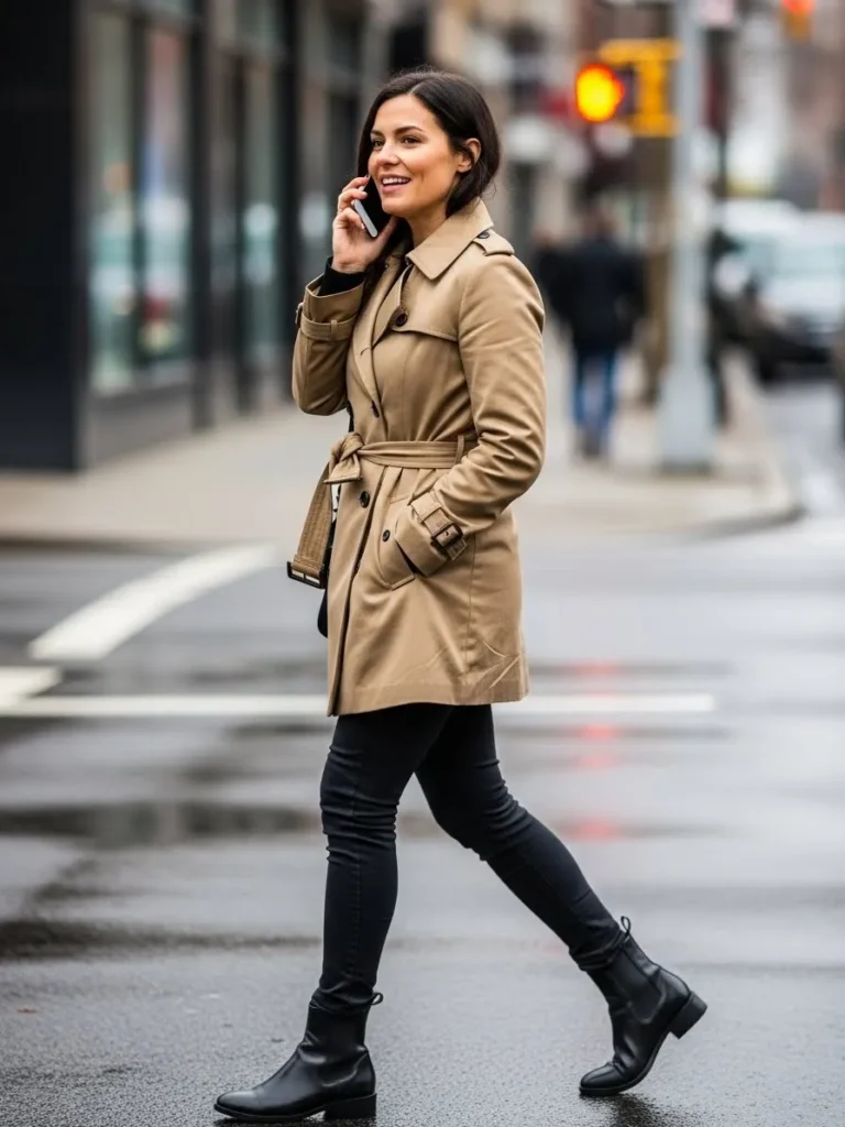 This look centers around a classic beige trench coat cinched at the waist, styled with black skinny pants and sleek ankle boots.