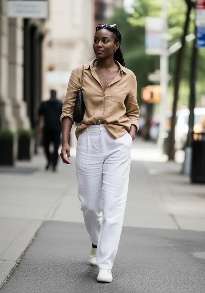 This works so well because the neutral tones feel timeless and easy to mix with other capsule pieces. I love how the white pants brighten the outfit while the tan top keeps it from feeling too sharp. It feels effortless and grown up in the best way.