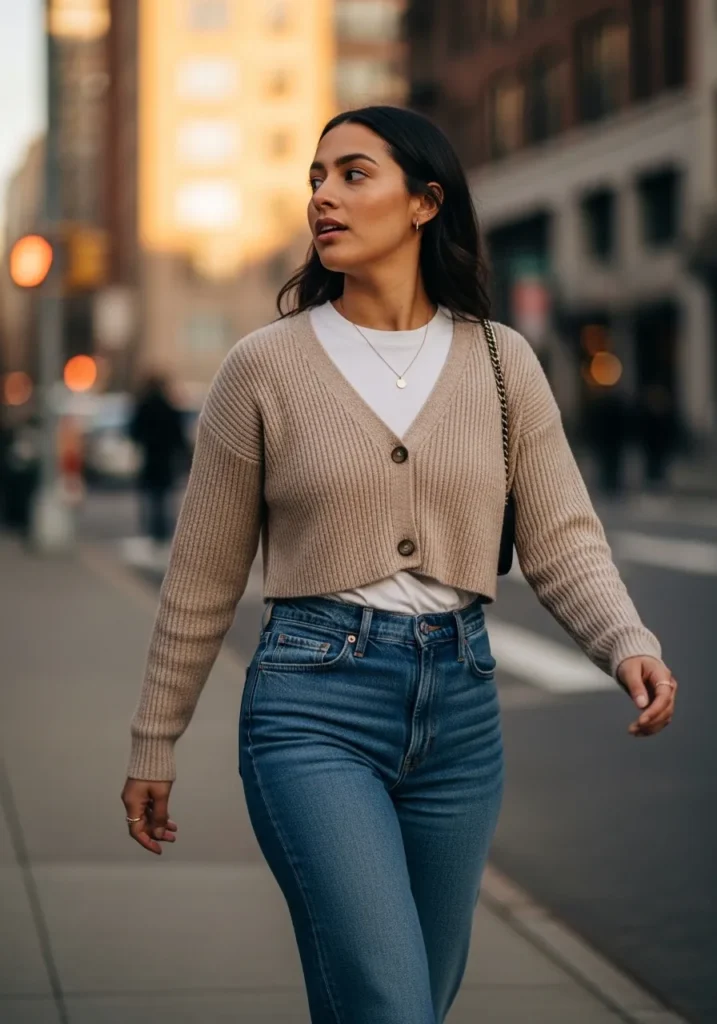 This look pairs a cropped neutral cardigan with a simple white tee and classic blue jeans. The fit is relaxed but flattering and the textures feel cozy without being heavy. It is a great example of casual spring layering done right.