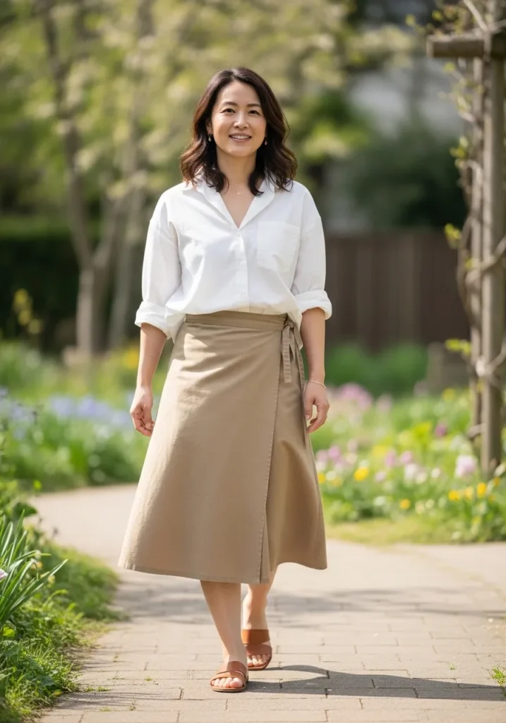 This look shows a crisp white button up shirt tucked into a flowy beige midi skirt. The fabrics look light and breathable with movement that feels perfect for spring. It has a calm and feminine feel while still staying simple.