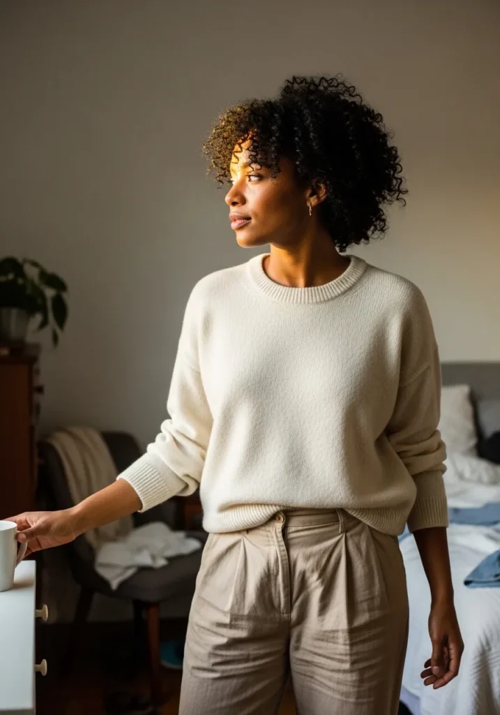 This works because it feels so wearable and real. I love how the knit balances the tailored feel of the pants. It is exactly the kind of outfit I would wear on a quiet day when I still want to look pulled together.