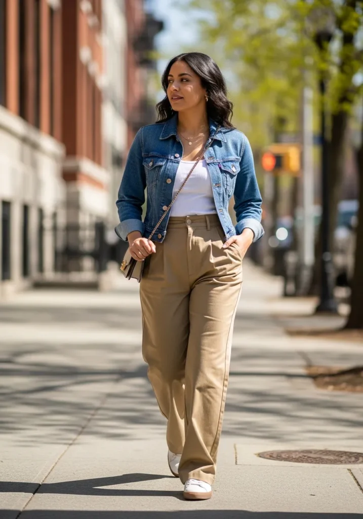 Here we see a classic denim jacket layered over a light top paired with beige trousers. The mix of casual denim and structured pants creates a nice balance. The overall look feels relaxed yet intentional.