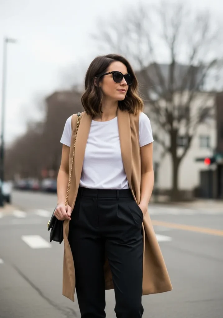 This outfit combines a simple white tee with black pants and a long neutral vest. The silhouette feels clean and elongated with very minimal detailing. It is modern and effortless with a strong capsule wardrobe feel.