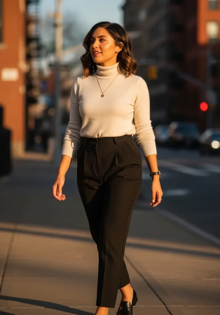 This look pairs a fitted cream long sleeve top with high waist black pants and simple heels. The silhouette feels clean and flattering with a classic color combination that never feels dated. It is sleek and minimal in the best way.