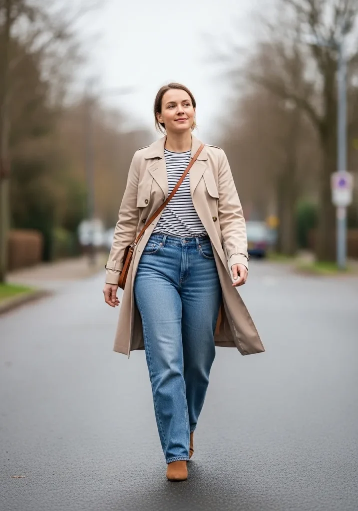 This outfit features a striped top layered under a light trench coat with classic blue jeans. The pieces feel timeless and very wearable with a relaxed spring street style vibe. It looks comfortable but thoughtfully styled.
