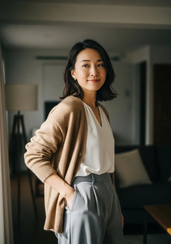 This look shows a cozy neutral cardigan worn over a simple white top with relaxed light trousers. The textures feel soft and natural and the color palette stays calm and cohesive. It feels very wearable and home to street friendly.
