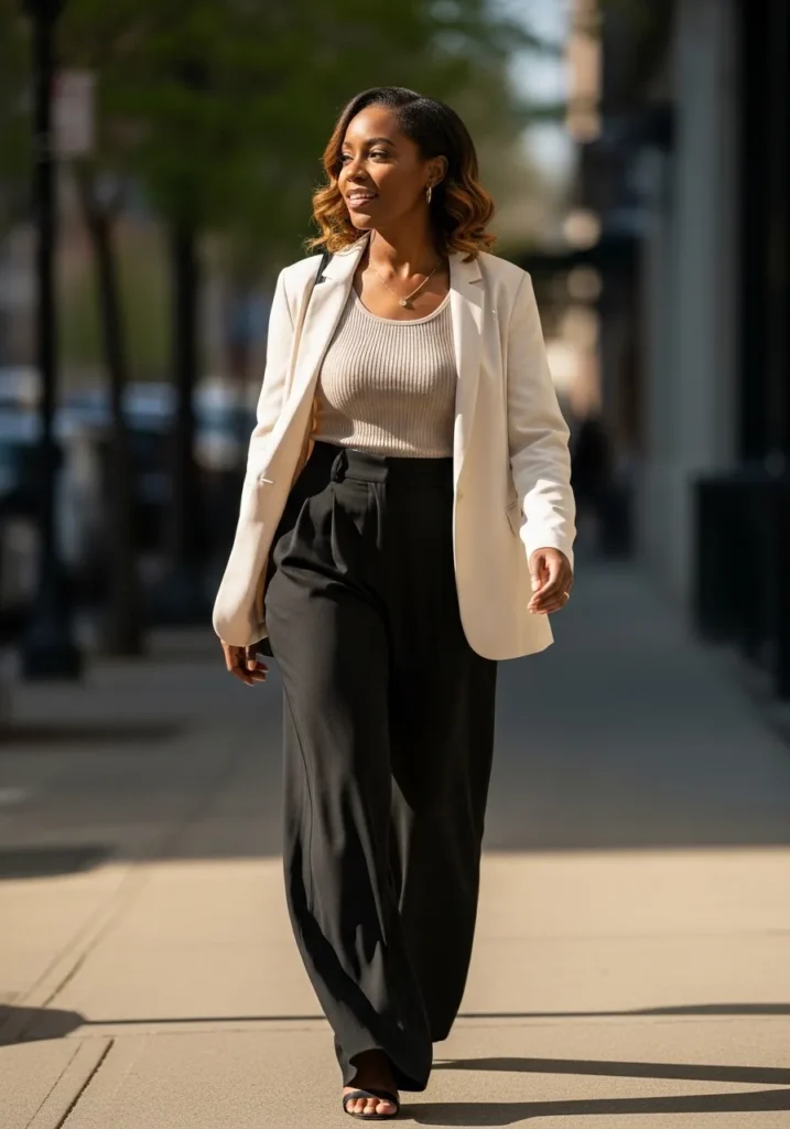 This outfit combines a crisp white blazer with a light top and flowing black pants. The contrast feels elegant while the fit stays relaxed and modern. It has a clean and confident capsule wardrobe feel.