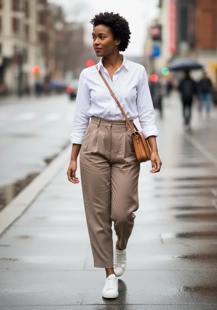 A clean white button down is tucked into high waisted taupe trousers with a relaxed tailored fit. The sleeves are casually rolled and the neutral sneakers keep the look grounded and modern. The whole outfit feels fresh structured and very city chic.