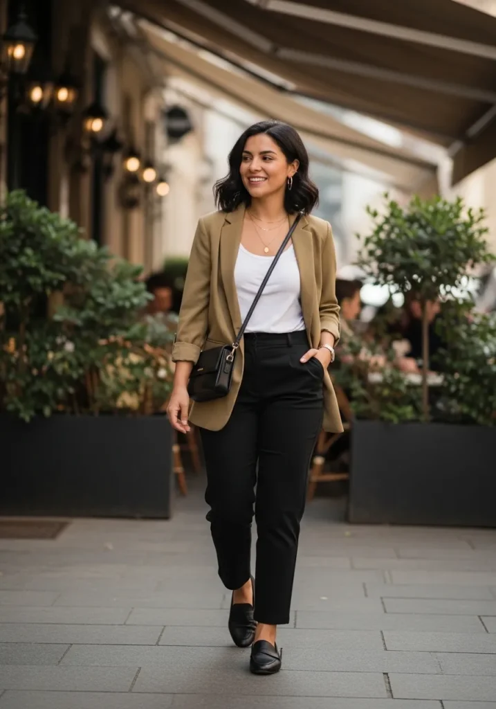 What I love here is how versatile it feels. You could wear this to work or out for coffee and still feel totally comfortable. The contrast between the blazer and the lighter pants keeps it interesting without being loud.